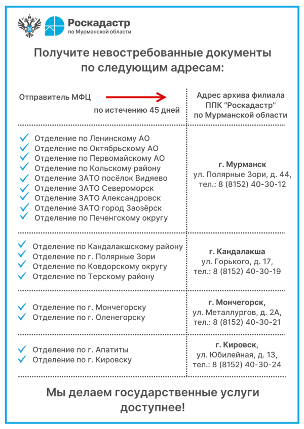 По истечении 45 календарных дней многофункциональный центр в течение 30 календарных дней осуществляет передачу документов на бумажном носителе в один из филиалов ППК «Роскадастр» по Мурманской области.